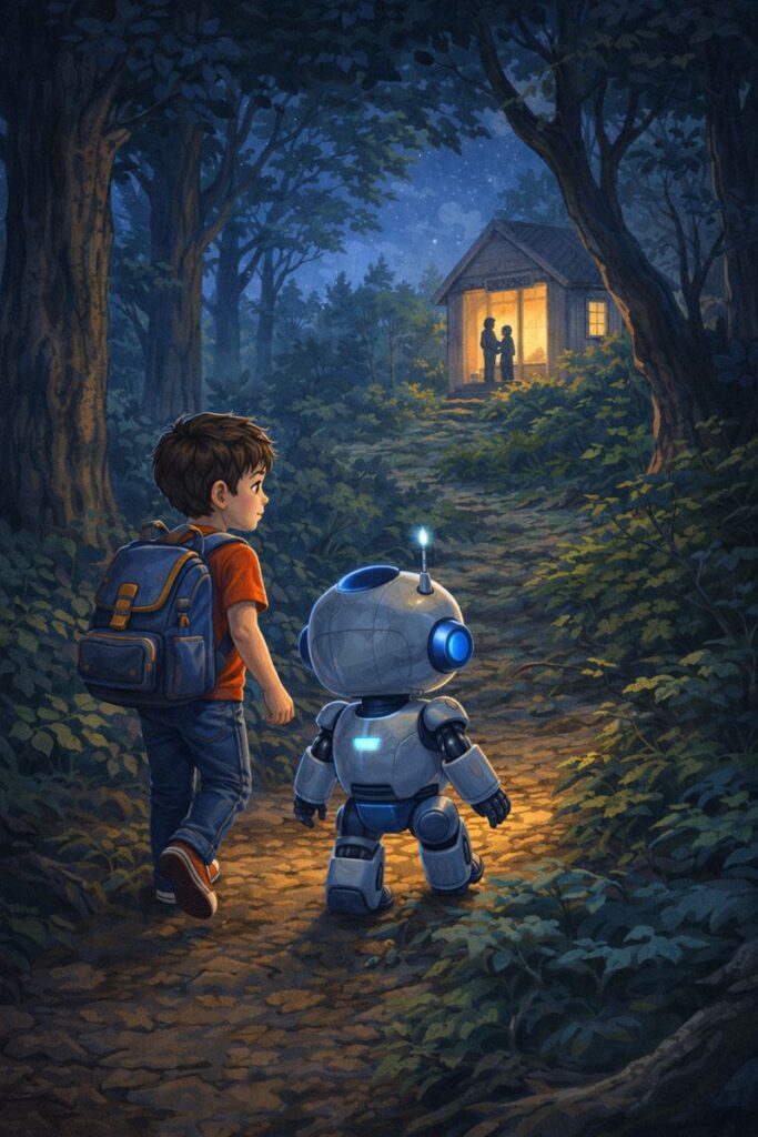 وہ چپکے سے اپنے روبوٹ کو ساتھ لے کر گھر سے نکل گیا۔ گھر کے قریب ہی ایک راستہ جنگل کی طرف جاتا تھا، دونوں اسی راستے پر چل پڑے۔