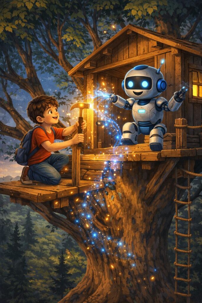 روبوٹ نے اپنی میجک پاورز استعمال کیں۔ جنگل میں موجود لکڑیوں کو ایک جگہ جمع کیا گیا، پھر انہیں درست سائز میں کاٹا گیا، مضبوطی سے جوڑا گیا اور آہستہ آہستہ درخت کے اوپر ایک خوبصورت لکڑی کا گھر تیار ہو گیا۔